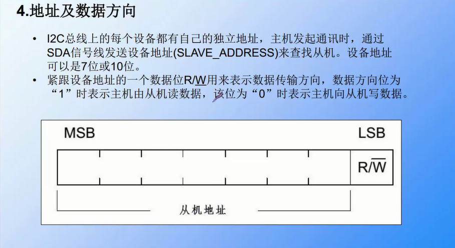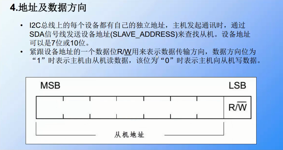 每条连接到总线的设备都有一个独立的地址(7位地址或者10位地址),主机可以利用这个地址进行不相同设备之间的访问。