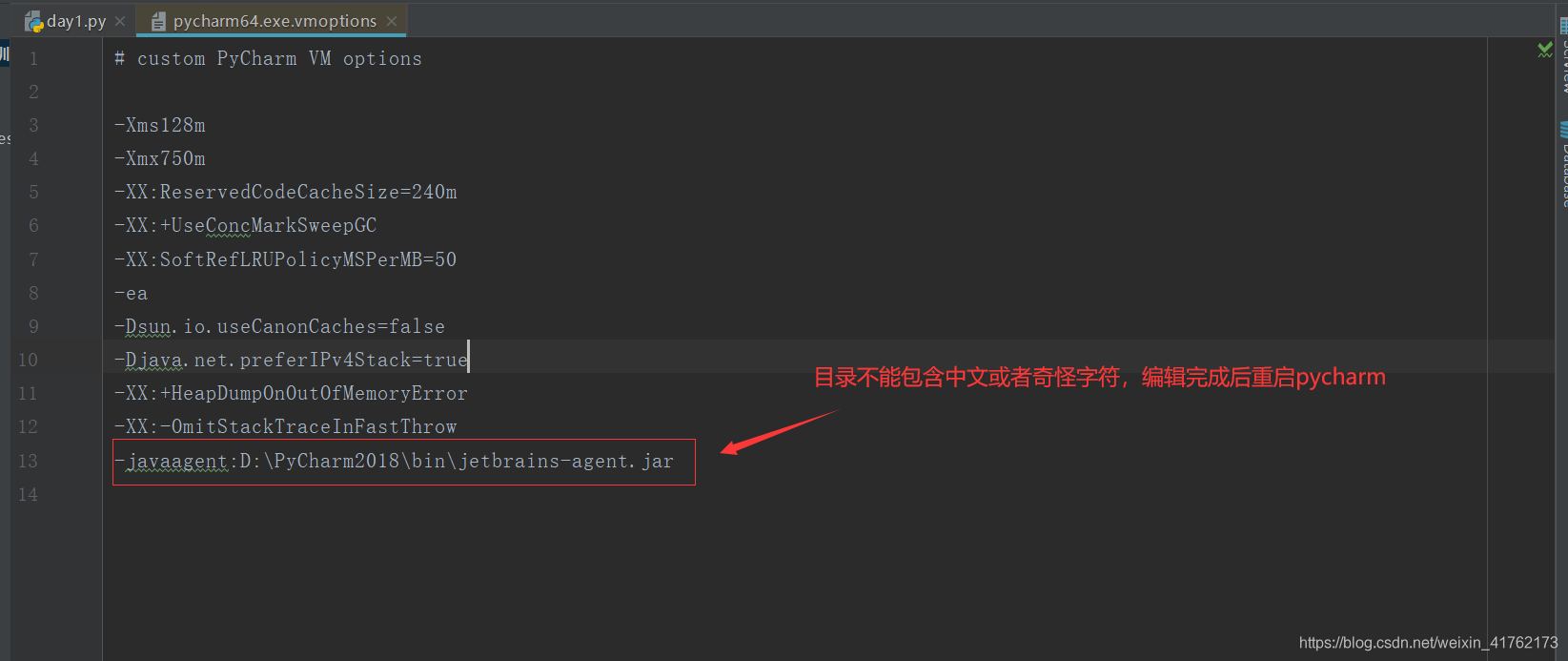 (-javaagent:你pycharm的安装目录\jetbrains-agent.jar)请仔细检查路径是否正确,如果错误则会出现pycharm打不开的情况(请确保你的pycharm路径不包含中文、空格或者其他奇怪的字符)
