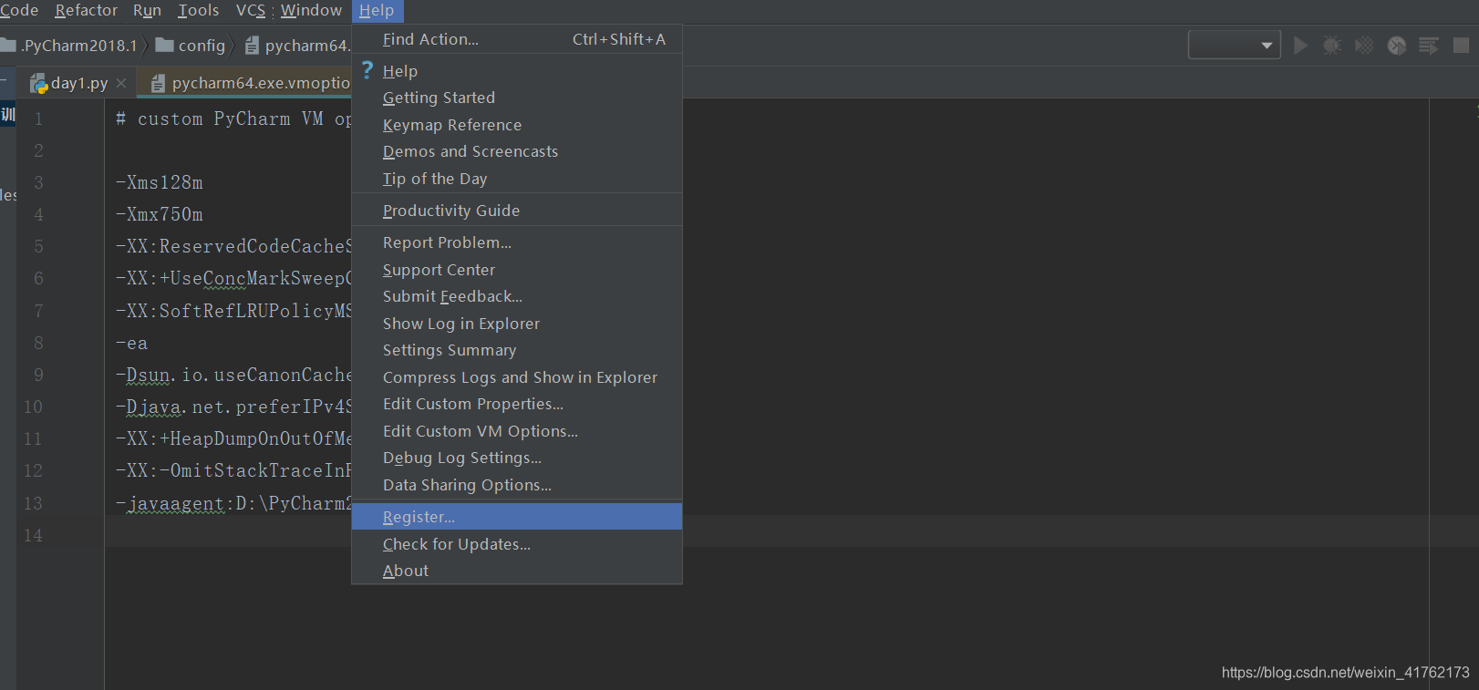 修改完配置文件之后重启pycharm,点击菜单栏中的 “Help” -> “Register …”