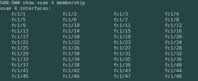 (config-vsan-db)# vsan 4 interface fc 1/1–48 #这是一台48口双层交换机,我们把全部光纤口绑定在vsan4上