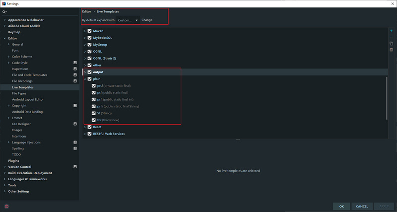 这些的模板可以在Settings -> Editor -> Live Templates 看到。使用者可以按照自己的使用习惯来熟悉相关的代码模板。