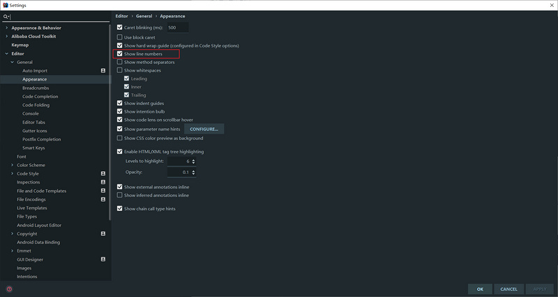 Settings -> Editor -> General -> Appearance 勾选 Show Line Numbers