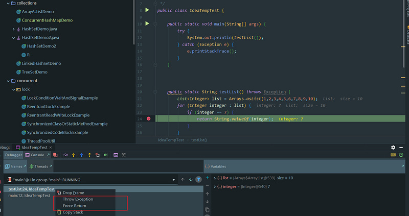IDEA 可以在打断点的方法栈处,强制抛出异常给调用方。这个在调试源码的时候非常有用。