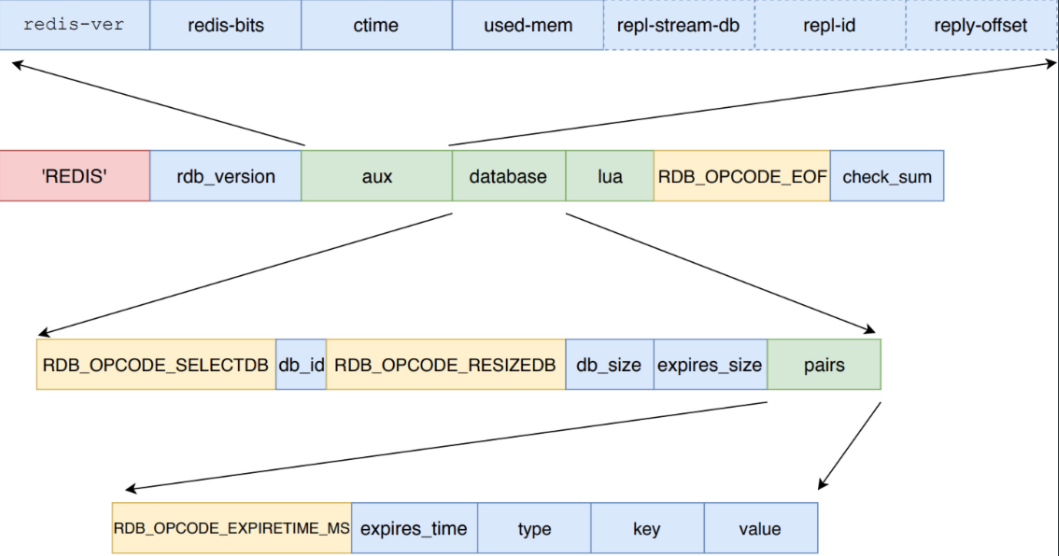 先写入 REDIS 魔法值,然后是 RDB 文件的版本( rdb_version ),额外辅助信息 ( aux )。辅助信息中包含了 Redis 的版本,内存占用和复制库( repl-id )和偏移量( repl-offset )等。