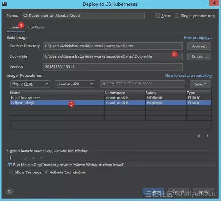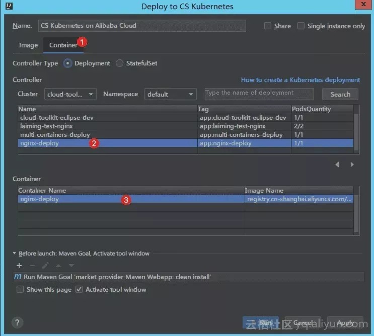 在 Intellij IDEA 中,鼠标右键项目工程名,在出现的菜单中点击 Alibaba Cloud --> Deploy to CS Kubernetes,出现如下部署窗口: