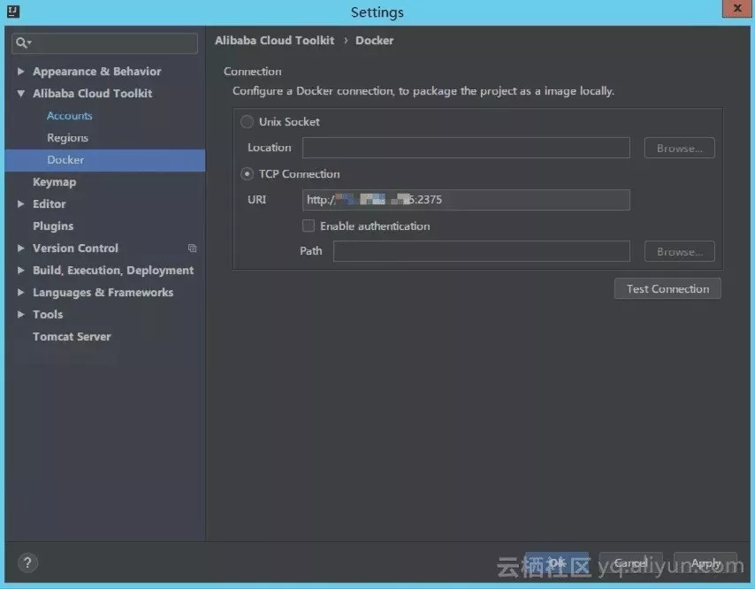 **点击:**顶部菜单 Tools --> Alibaba Cloud Toolkit --> Preferences --> 左边列表的 Alibaba Cloud Toolkit --> Docker。