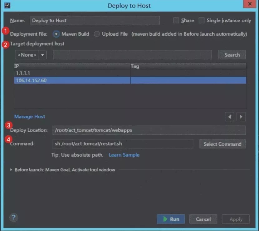 Deploy Location:输入在 ECS 上部署路径,如 /root/tomcat/webapps;