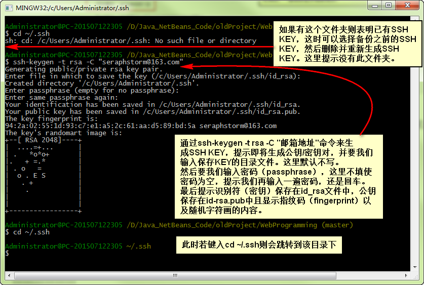 首先在Git Bash中使用cd ~/.ssh命令查看是否已有SSH KEY,如果没有SSH KEY则不会有此文件夹,有的话就将SSH KEY备份并删除;