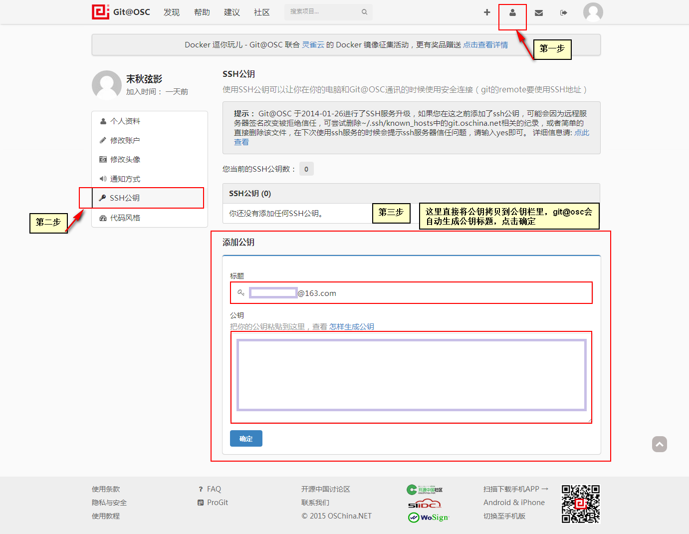登录git@osc→点击个人资料→SSH公钥然后添加公钥