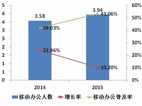 报告调研数据表明,截止2015年底,中国各种移动办公App正式的企业用户数量达到137.7万家,各种移动办公App的使用员工数达到4211.2万人,移动办公人数则达到3.94亿人。