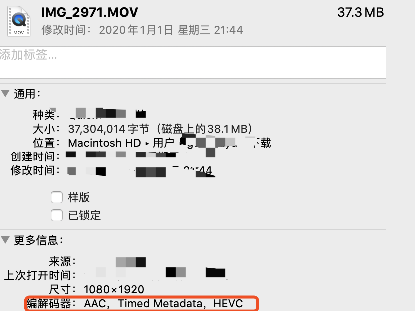 首先,如下图所示是一个 .MOV 的视频文件,可以看到更多信息栏里编码器有 AAC 、HEVC ,而这个就是视频的音频编码和视频编码,而 MOV 其实就是封装协议,这其实就是我们接下来要介绍的基本概念。