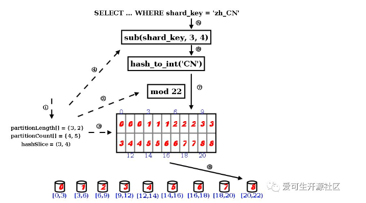 当分片索引不是纯整型的字符串时,只接受整型的内置 hash 算法是无法使用的。为此,stringhash 按照用户定义的起点和终点去截取分片索引字段中的部分字符,根据当中每个字符的二进制 unicode 值换算出一个长整型数值,然后就直接调用内置 hash 算法求解分片路由:先求模得到逻辑分片号,再根据逻辑分片号直接映射到物理分片。