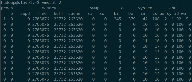 当一直监控时,可以省去采集次数,即 vmstat 2,每隔2秒采集一次,一直持续。