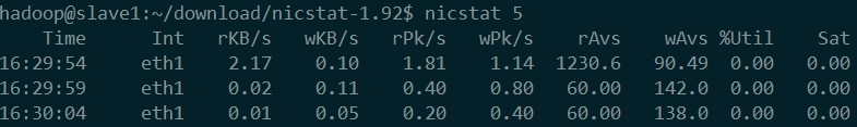 6、监控网络IO:在分布式java应用中,网络也成为性能的一个重要因素。监控网络主要是监控网卡接收和发送数据的情况,因此不能使用netstat。采用nicstat,安装参考http://xuclv.blog.51cto.com/5503169/1157208