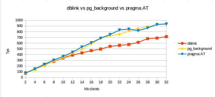 匿名自治事务的性能基准比较,使用 dblink、 pg_background 以及语法补丁程序来实现。 ###匿名自治事务性能基准比较