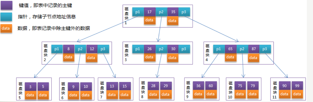 (个人理解:关键字上的数据存储在本节点上,每个范围内的数据存储在下一个节点上,叶子节点只存储数据)