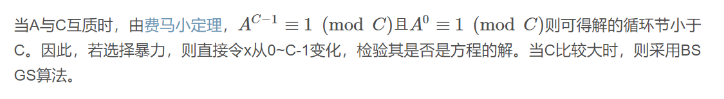 解决问题为求\(A^x\equiv B(mod C)\)的最小整数解,其中\(A C\)互质。
