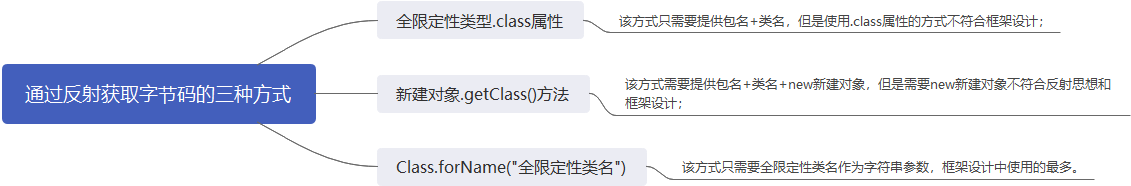 Java反射机制中获取字节码对象有三种方式,各个方式各有优缺,如下图:
