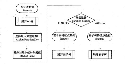 K维划分原则:将一个K维数据与Kd-tree的根结点和中间结点进行比较,只不过不是对K维数据进行整体的比较,而是选择某一个维度Di(i代表维度x,y,z等),然后比较两个K维数在该维度Di上的大小关系,即每次选择一个维度Di来对K维数据进行划分,相当于用一个垂直于该维度Di的超平面将K维数据空间一分为二,平面一边的所有K维数据在Di维度上的值小于平面另一边的所有K维数据对应维度上的值。也就是说,我们每选择一个维度进行如上的划分,就会将K维数据空间划分为两个部分,如果我们继续分别对这两个子K维空间进行如上的划分,又会得到新的子空间,对新的子空间又继续划分,重复以上过程直到每个子空间都不能再划分为止。(此过程会涉及两个疑问:1.每次对子空间的划分时,怎样确定在哪个维度上进行划分;2。在某个维度上进行划分时,怎样确保在这一维度上的划分得到的两个子集合的数量尽量相等,即左子树和右子树中的结点个数尽量相等)