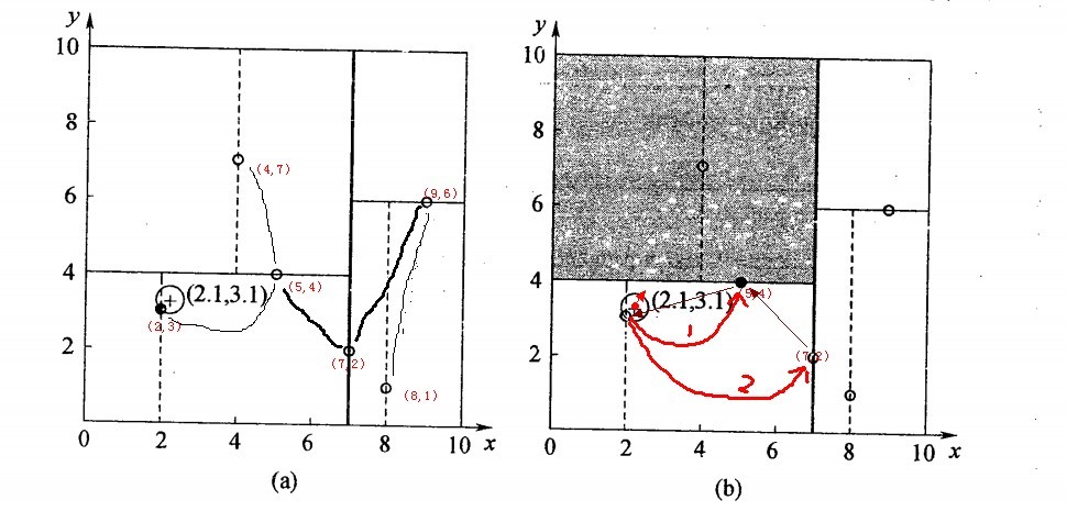 星号表示要查询的点(2.1,3.1)。通过二叉搜索,顺着搜索路径很快就能找到最邻近的近似点,也就是叶子节点(2,3)。而找到的叶子节点并不一定就是最邻近的,最邻近肯定距离查询点更近,应该位于以查询点为圆心且通过叶子节点的圆域内。为了找到真正的最近邻,还需要进行相关的‘回溯'操作。也就是说,算法首先沿搜索路径反向查找是否有距离查询点更近的数据点。