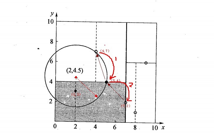 - 以(2,4.5)为圆心,以3.041为半径作圆,如下图所示。可见该圆和y = 4超平面交割,所以需要进入(5,4)左子空间进行查找,也就是将(2,3)节点加入搜索路径中得<(7,2),(2,3)>;于是接着搜索至(2,3)叶子节点,(2,3)距离(2,4.5)比(5,4)要近,所以最近邻点更新为(2,3),最近距离更新为1.5;