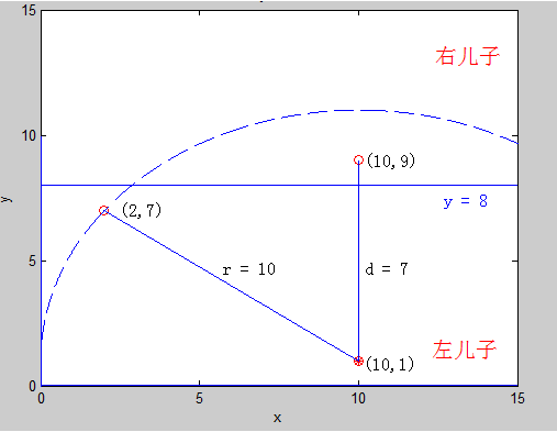 在查询到左儿子的时候,我们发现,现在最小的距离是 r = 10 ,当回溯到父亲节点的时候,我们发现,以目标点(10,1)为圆心,现在的最小距离 r = 10 为半径做圆,与分割平面 y = 8 相交,这时候,如果我们不在父亲节点的右儿子进行一次查找的话,就会漏掉