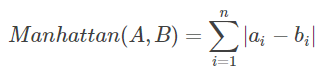 在n维欧式空间中,任意两点A=(a1,a2,...,an),B=(b1,b2,...,bn),曼哈顿距离为: