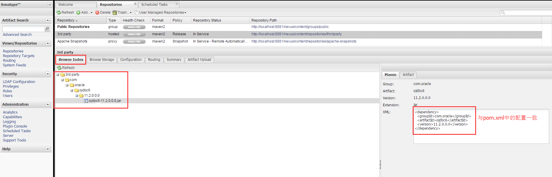 4.宿主仓库的使用,上面提到的一些特殊的商业性质相关的jar文件,比如oracle的驱动包,ojdbc.jar并不支持远程下载,这时候可以将我们本地下载好的jar包上传到私服。