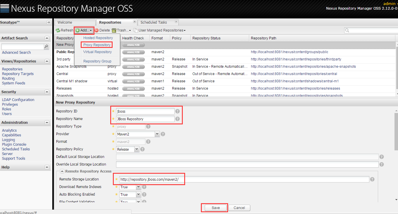 - 3.添加自己代理的远程库,有时候我们的项目需要引入一些特殊的jar文件,比如Jboss的某些jar包,这时候也可以在私服中代理该远程仓库: