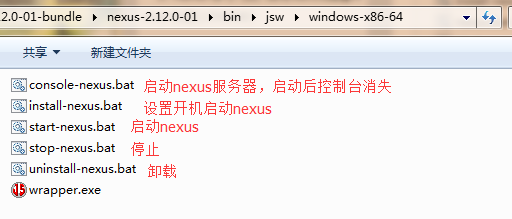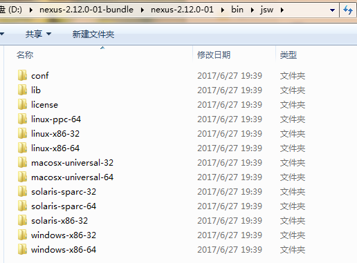 - 下载完成后解压即可,解压完成到目录nexus-2.12.0-01-bundle\nexus-2.12.0-01\bin\jsw下可以看到: