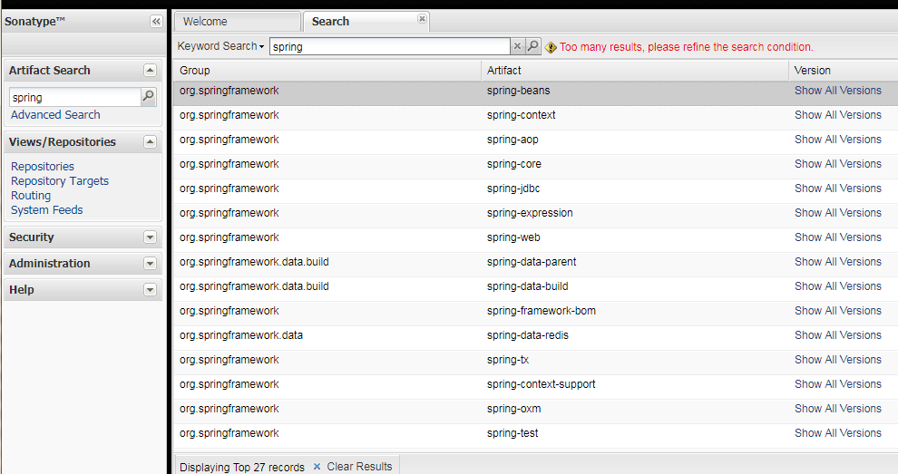 保存后可以在Adminstration下--Scheduled Tasks可以看到下载进度是running,下载完之后在左侧搜索栏搜索jar包比如所有spring就会出现
