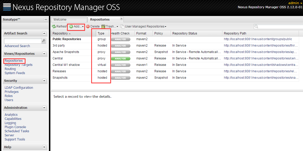 可以看到默认有一些仓库,仓库类型Type或名称的意义: