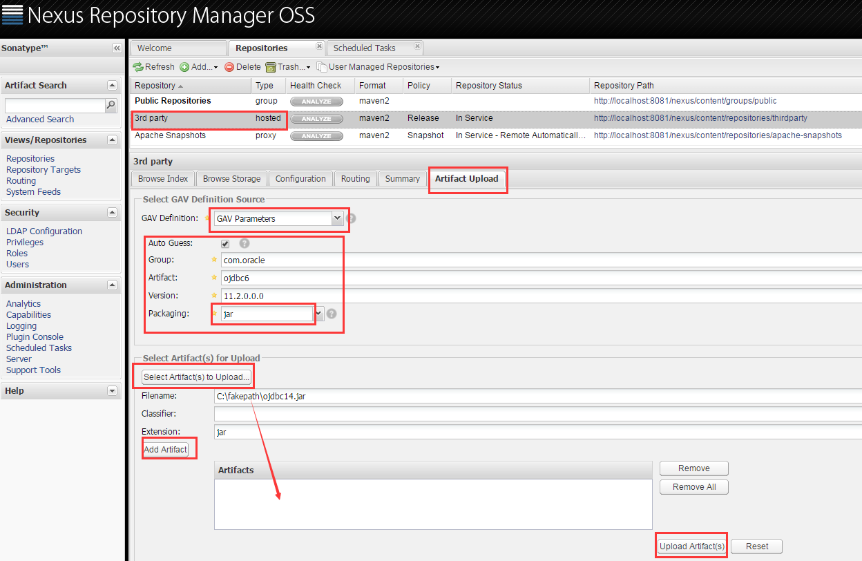 注意GAV设置要与你pom.xml中一致,上传后添加到Artifacts点击上传即可: