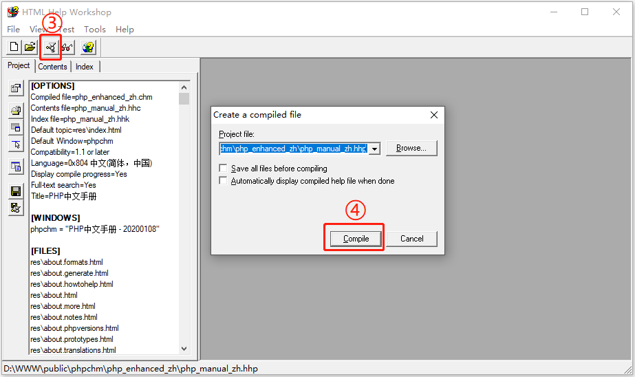 - 用 HTML Help Workshop 打开生成的 php_enhanced_zh/php_manual_zh.hhp