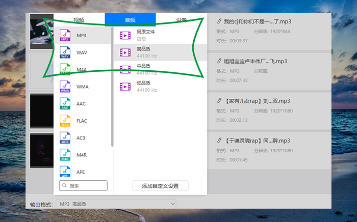 4、当然也是有很多人需要听取更加完美的音乐,所以就需要设置更多的音频参数,直接在输出格式中点击自定义设置,然后就可以选择了,