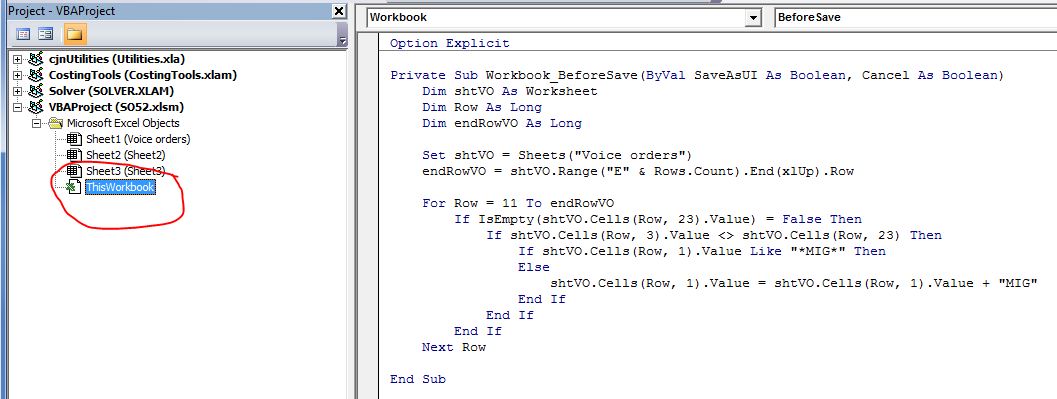 shtVO.Cells(Row, 1).Value = shtVO.Cells(Row, 1).Value + "MIG"