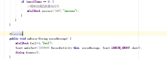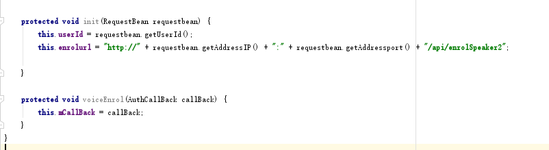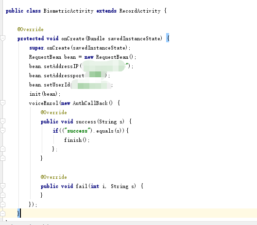 这里我实现会RequestBean参数对象并赋值,调用init初始化,最后调用voiceEnrol进行结果的成功与回调,最后根据回调结果客户可在success与fail中进行逻辑代码的执行