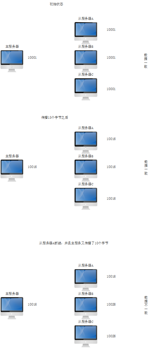 因此得到一个结论:如果主从服务器处于一致状态,那么它们的复制偏移量相同,否则不相同。