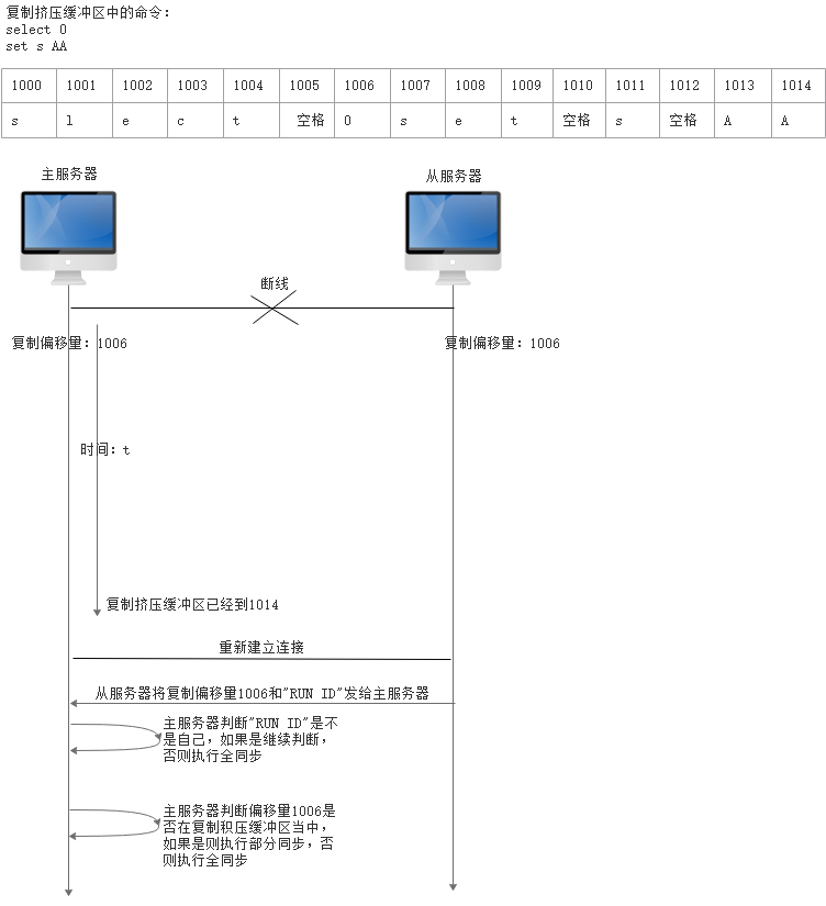 主服务器判断1006之后的数据是否在复制挤压缓冲区当中,如果没有则进行全同步,否则将复制挤压缓冲区中1006之后的数据全部发送给从服务器