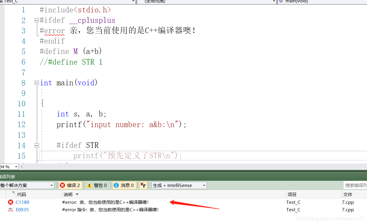 注意,宏串error-message不用双括号包围。遇到#error 指令时,错误信息被显示,可能同时还显示编译程序作者预先定义的其他内容。