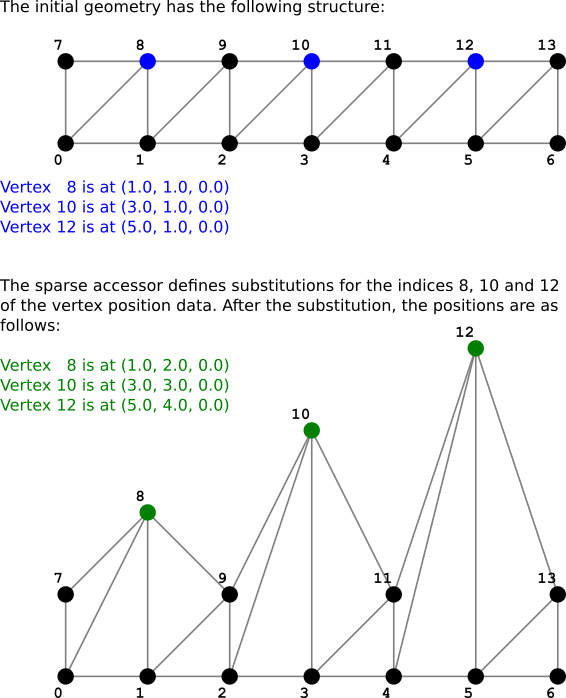 该示例包含两个访问器:一个用于网格的索引,另一个用于顶点位置。引用顶点位置的一个定义一个额外的accessor.sparse 属性,其中包含有关应应用的稀疏数据替换的信息: