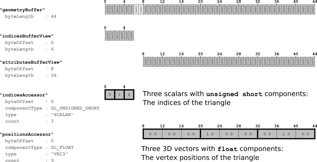 Data contents 数据内容 accessor还包含汇总其数据内容的最小和最大属性。它们是accessor中包含的所有数据元素的组件最小值和最大值。因此,在顶点位置的情况下,最小和最大值属性定义对象的边界框。这对于确定下载优先级或可见性检测非常有用。通常,此信息对于存储和处理在运行时由呈现器取消量化的量化数据也很有用,但此量化的详细信息超出了本教程的范围。