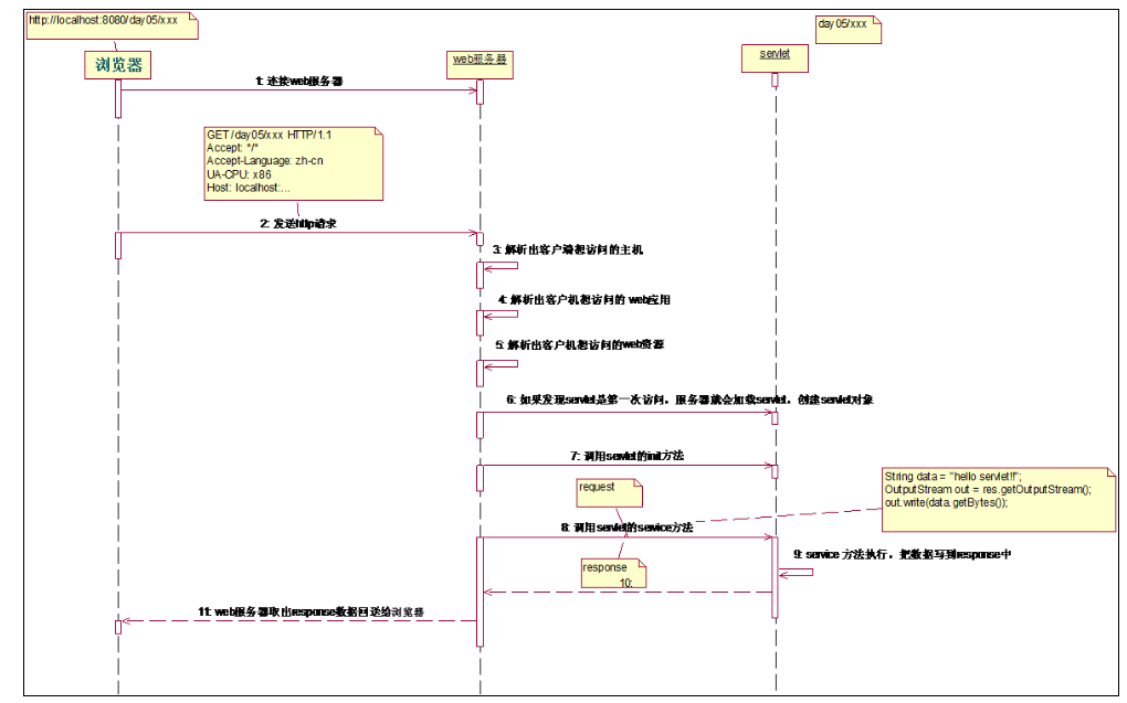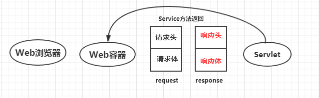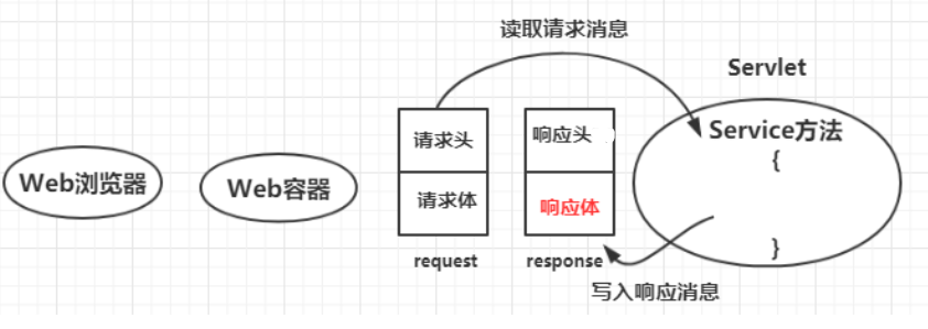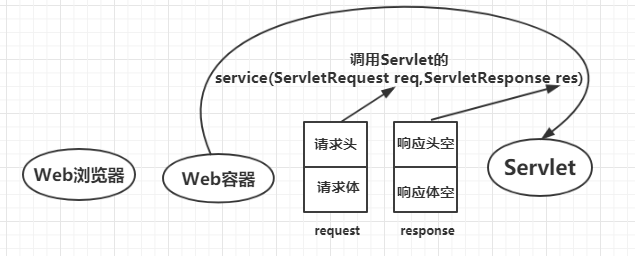 ④Web容器Servlet的Service(ServletRequest request,ServletResponse response)方法,并将请求对象和响应对象传递给该方法。
