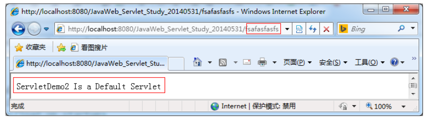 当访问不存在的Servlet时,就使用配置的默认Servlet进行处理,如下图所示:
