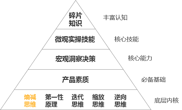 我读完受益匪浅,结合了自己的工作经历和感悟,总结了以下五种基本思维方式:熵减思维、第一性原理、缩放思维、迭代思维、逆向思维。同时,这些思维方式也处于我理解的产品经理能力金字塔模型的最底层。