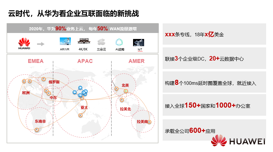 华为是一个全球化公司,业务遍布世界各地,截止2018年,全球已经拥有数百条专线,连接了欧洲、美洲和亚太等地区。拥有超过20个数据中心,构建了全球8个100毫秒内的延时圈,连接全球150个国家和超过1千个办公室,每年的专线费用高达数亿美金。
