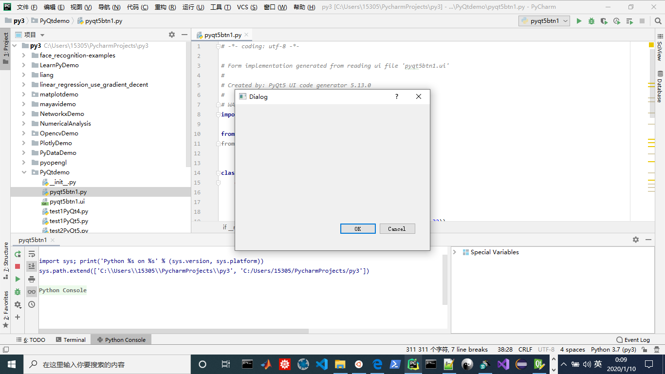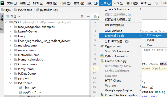 在工作目录(C:\Users\15305\PycharmProjects\py3\PyDataDemo>)下运行qt designer