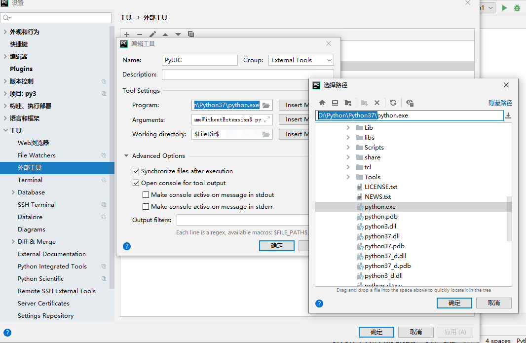 PyUIC设置与Qt Designer大同小异,主要将Program换成PyUIC路径,完整路径为D:\Python\Python37\python.exe。