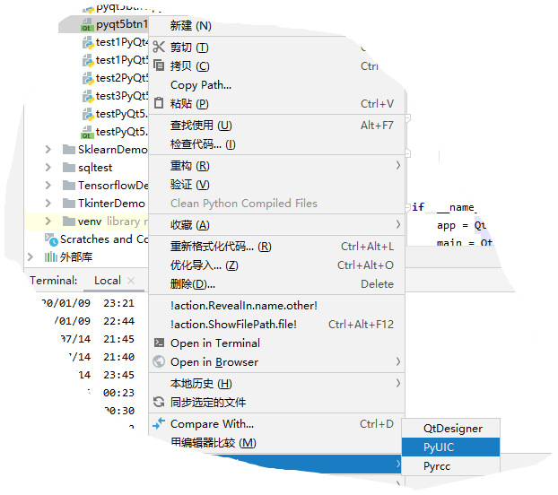 右击pyqt5btn1.ui运用PyUIC工具会生成pyqt5btn1.py
