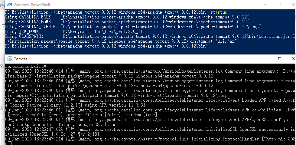 在bin路径下,点击Shift右键选择Powershell,敲startup,若出现Neither the JAVA_HOME nor the JRE_HOME environment variable is defined的错误,则修改setclasspath.bat将下面两句加到下方出